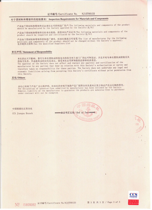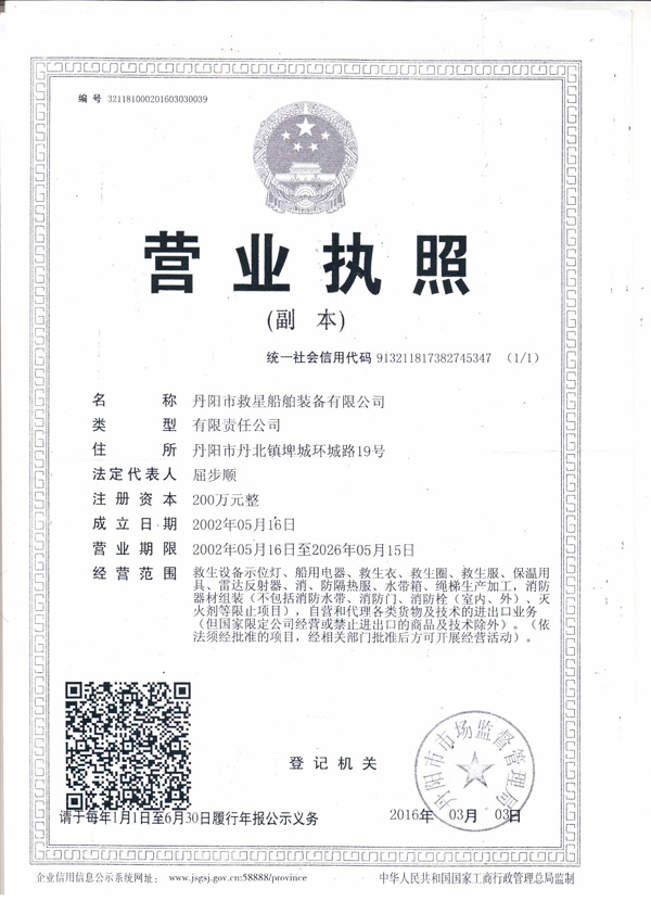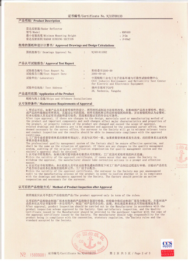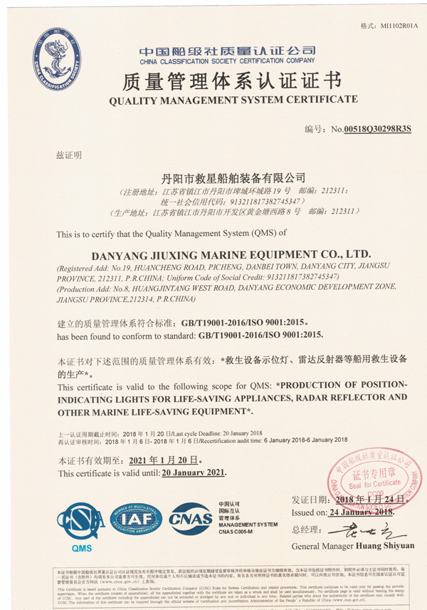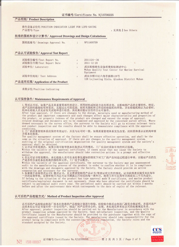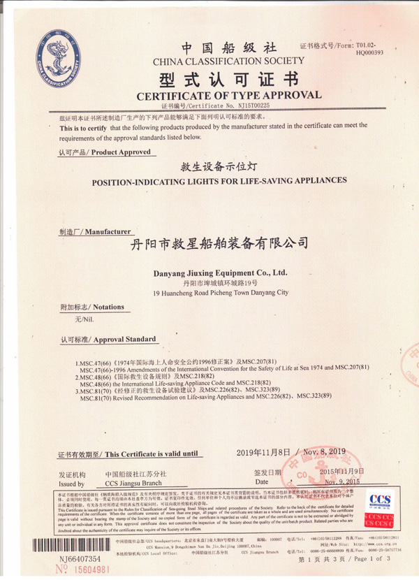 丹陽(yáng)市救星船舶裝備有限公司為丹陽(yáng)市船舶救生照明設(shè)備廠子公司,主要生產(chǎn)救生設(shè)備示位燈、雷達(dá)反射器、引航員軟梯、登乘梯等產(chǎn)品。其中救生設(shè)備示位燈采用國(guó)際上最先進(jìn)的科學(xué)技術(shù)、生產(chǎn)工藝,優(yōu)質(zhì)材料制造,各項(xiàng)技術(shù)指標(biāo)超過(guò)國(guó)際先進(jìn)水平,完全滿足國(guó)際最新標(biāo)準(zhǔn)。2012年元月取得“CCS”型式認(rèn)可證書(shū),并具有歐共體“EC”證書(shū)。另外本公司制造的RDF400雷達(dá)反射器還獲得了實(shí)用新型專利。